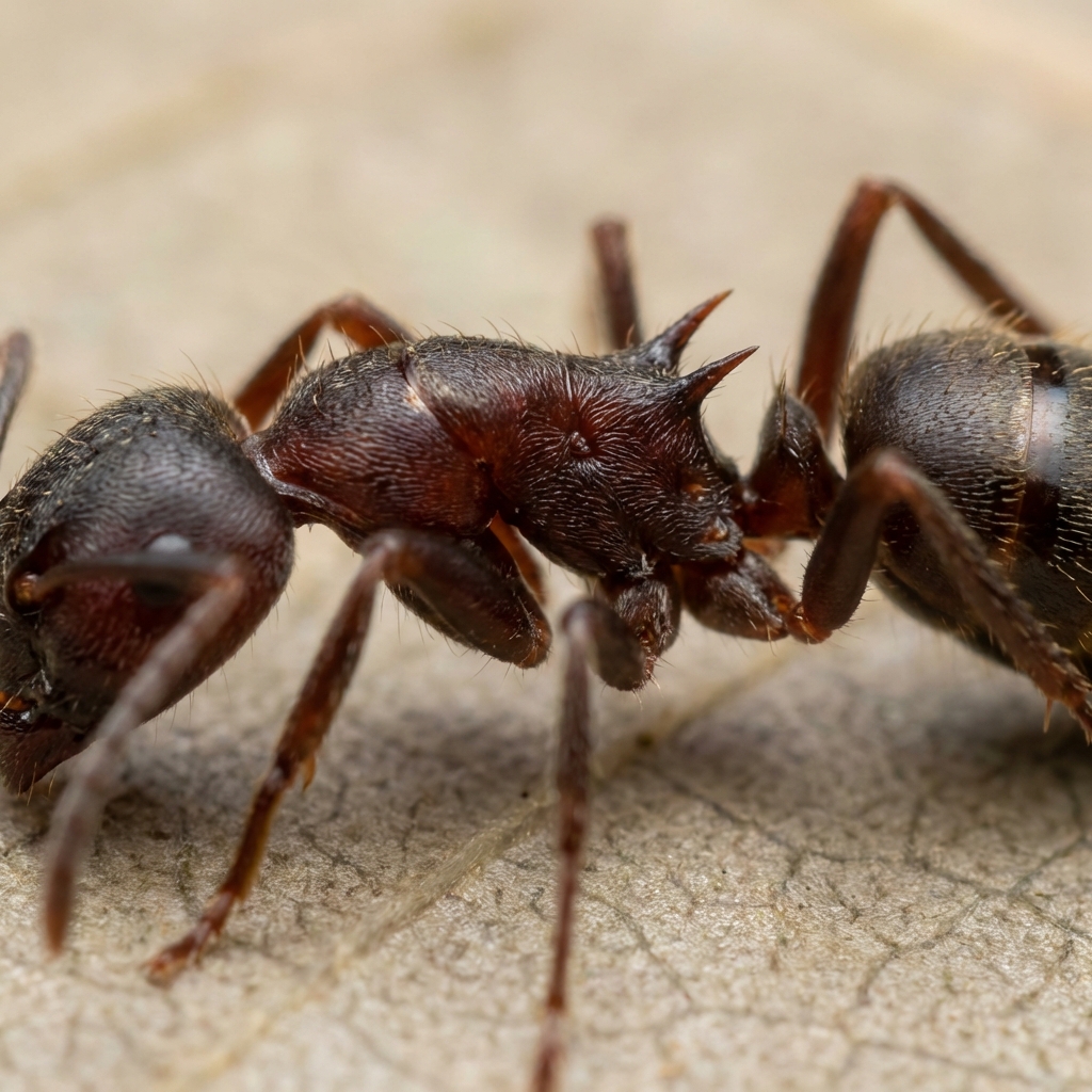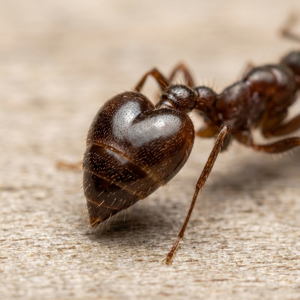 Acrobat ants are small (1/8 to 1/4 inch long) and range in color from light brown to black. Their most distinctive feature is their heart-shaped abdomen, which they can raise over their head and thorax, especially when disturbed. They also have two spines on their thorax.