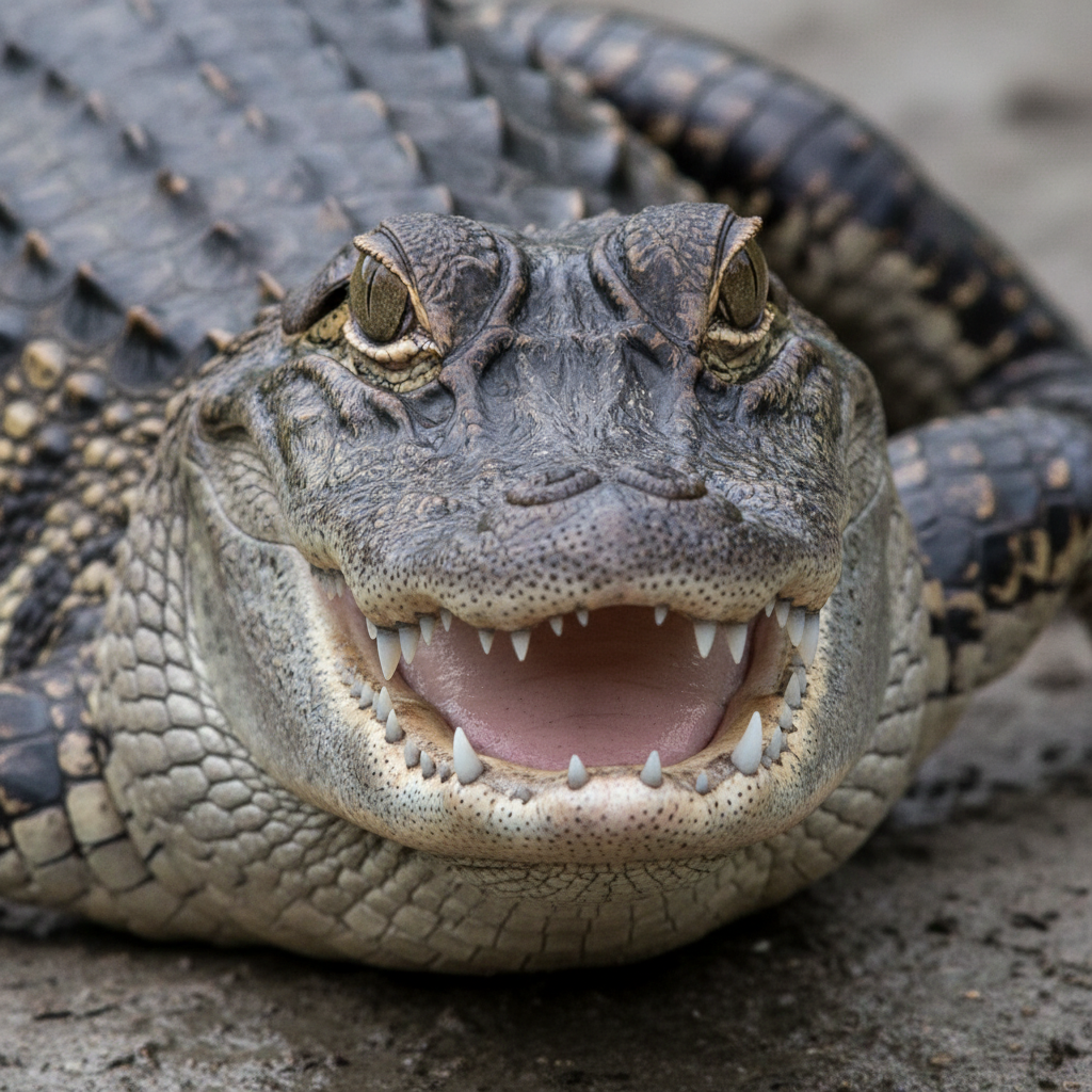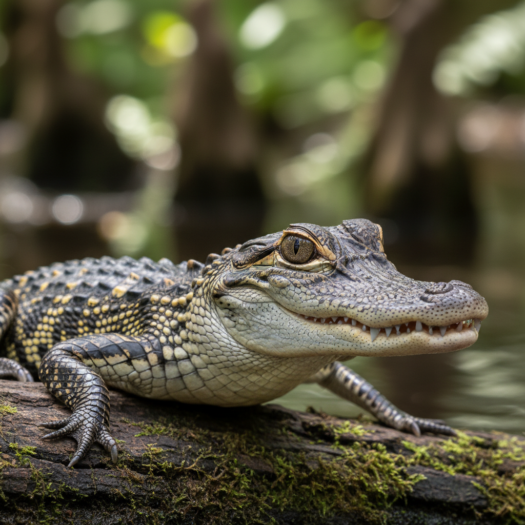 American alligators are large reptiles with broad snouts and dark gray to black coloration. Juveniles have bright yellow banding that fades with age. Adults can range from 6 to 14 feet in length and are powerful predators with strong jaws and sharp teeth.