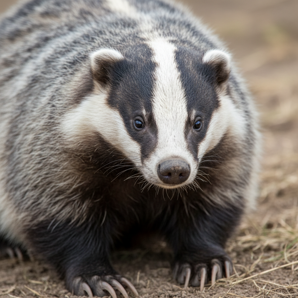 American badgers are stout, low-slung mammals with short, powerful legs and long claws adapted for digging. They have a distinctive white stripe running from their nose over the top of their head. Their fur is typically grizzled gray or reddish, and they have a flattened body shape.