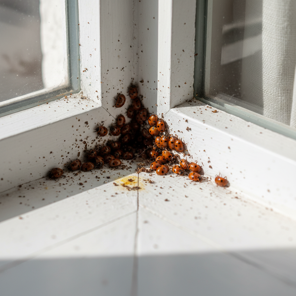 Large numbers of Asian lady beetles clustering on walls, ceilings, and windows, especially on the south and west sides of buildings, indicates an infestation. You may also find them congregating around light fixtures. They can also leave behind a yellowish staining fluid and a musty odor.