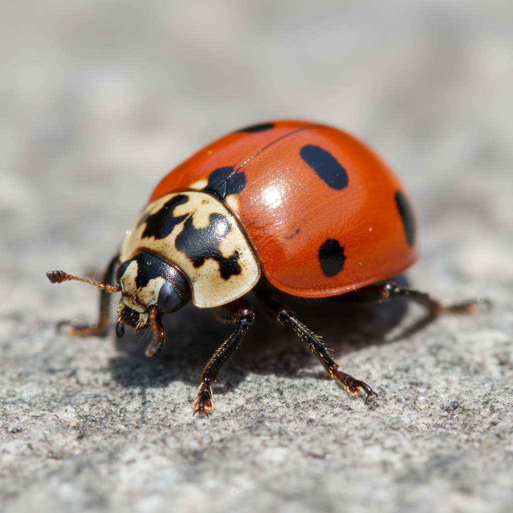 Asian lady beetles are typically orange to red in color with varying numbers of black spots, though some are yellow or even black. They are oval-shaped and about 1/4 inch long. A key identifier is the 'M' or 'W' shaped marking behind their head.