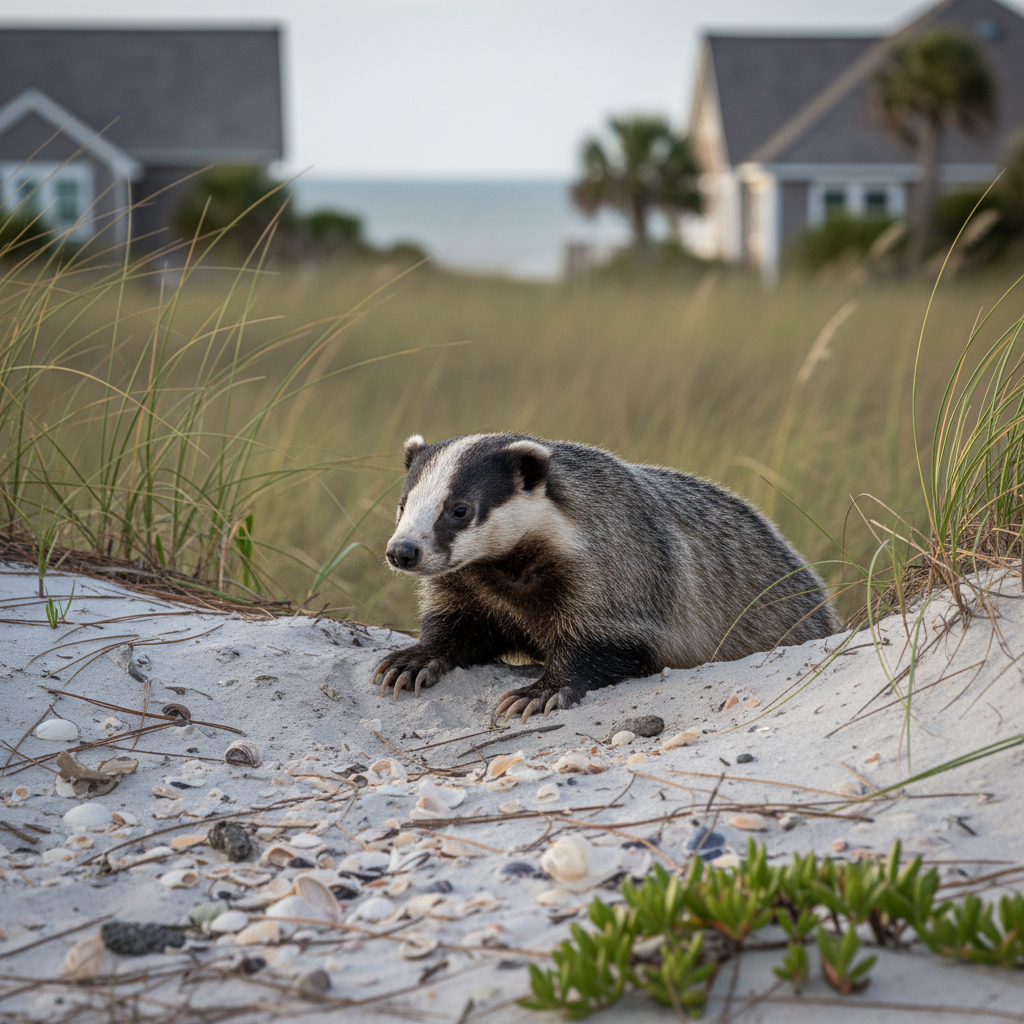 Badgers prefer open grasslands, prairies, and agricultural areas, but can occasionally venture into suburban areas along the Grand Strand in search of food. They dig burrows in sandy soils for shelter and hunting, often near coastal scrub or wooded edges.