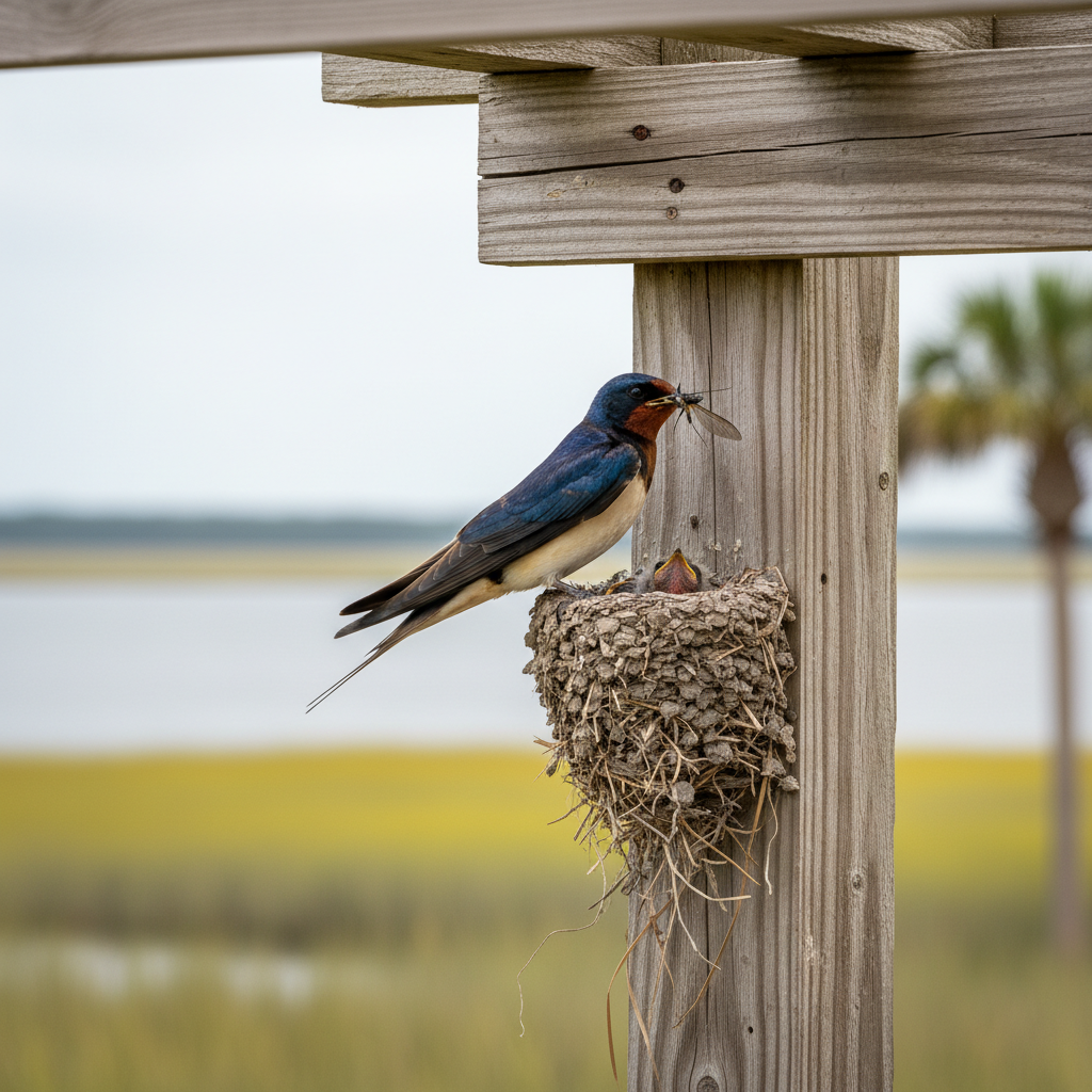 Barn swallows thrive in open habitats near water sources, making the coastal areas of South Carolina ideal for them. They are commonly found near farms, marshes, and residential areas along the Grand Strand. The humid subtropical climate provides ample insects for them to feed on and suitable nesting sites.