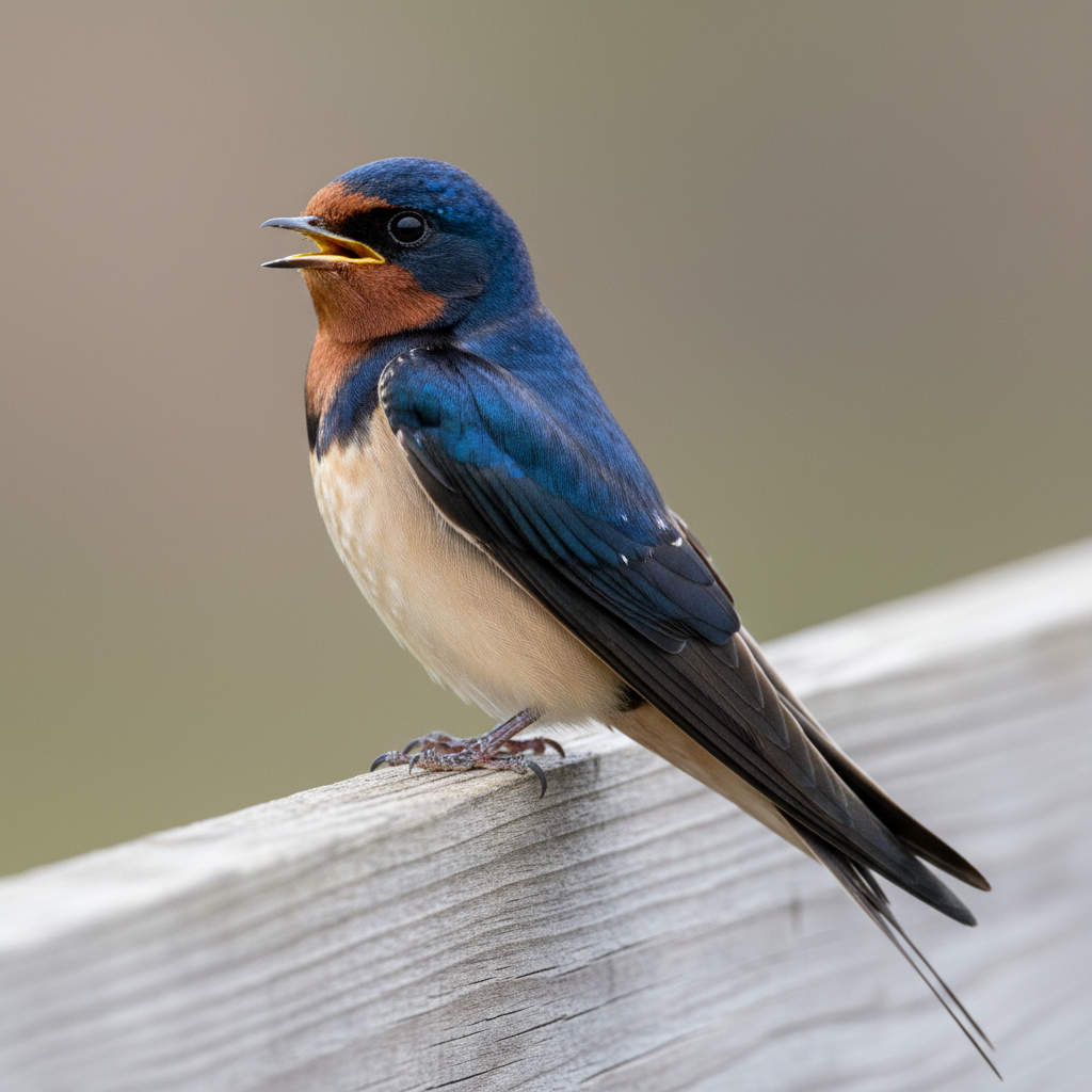 Barn swallows are small birds with iridescent blue-black backs, reddish-brown faces and throats, and deeply forked tails. They are agile fliers, often seen swooping low over fields and water in search of insects. Their distinctive mud nests are a common sight under eaves and bridges.