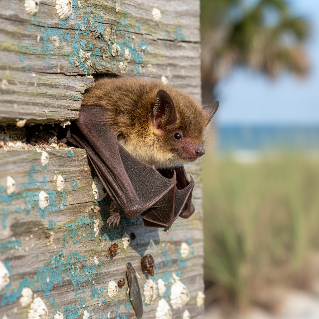 Big brown bats thrive in coastal South Carolina's humid subtropical climate. They commonly roost in attics, barns, and other structures, taking advantage of the warm temperatures and abundant insect prey. They can be found throughout the Grand Strand area, often near waterways and wooded areas.