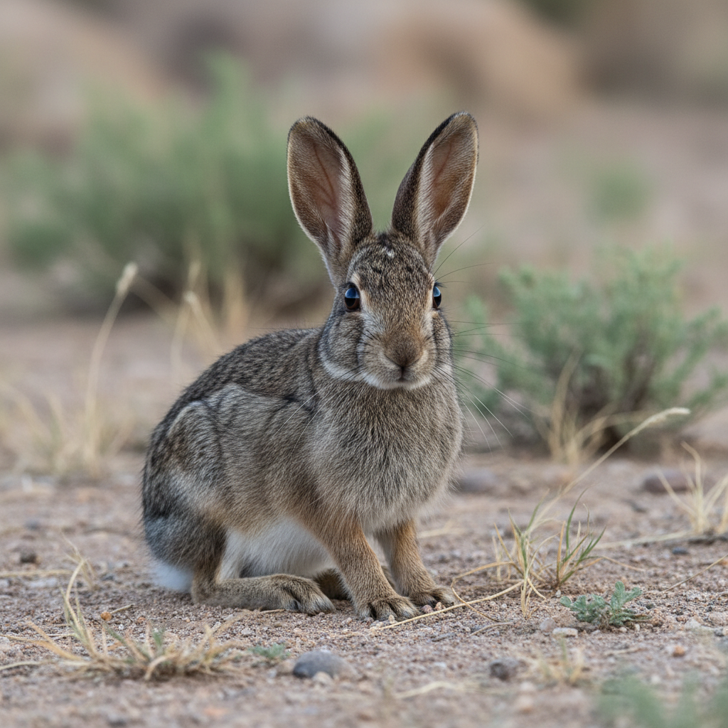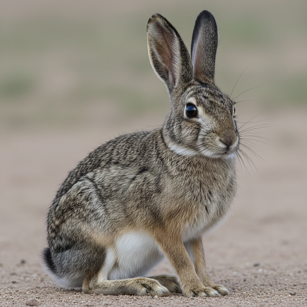 Black-tailed jackrabbits are large hares with distinctive black stripes on their long ears and a black stripe along the top of their tail. They have powerful hind legs adapted for running and leaping, and their fur is typically a grayish-brown color, providing excellent camouflage.