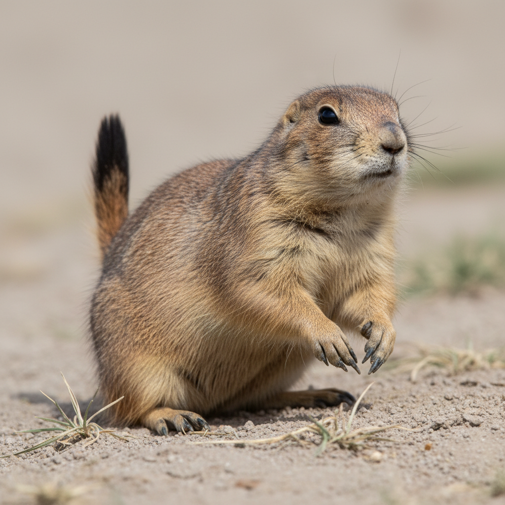 Black-tailed prairie dogs are stout-bodied rodents with short tails, weighing 1-3 pounds. They have buff-colored fur, small ears, and distinctive black tips on their tails. Their posture is typically upright, especially when surveying their surroundings.