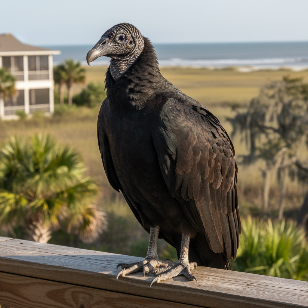 Black vultures are common in the coastal areas of South Carolina, including the Grand Strand. They prefer open areas near forests, roosting in trees, on utility poles, and on rooftops. The warm, humid subtropical climate of Myrtle Beach provides ideal conditions for these scavengers.