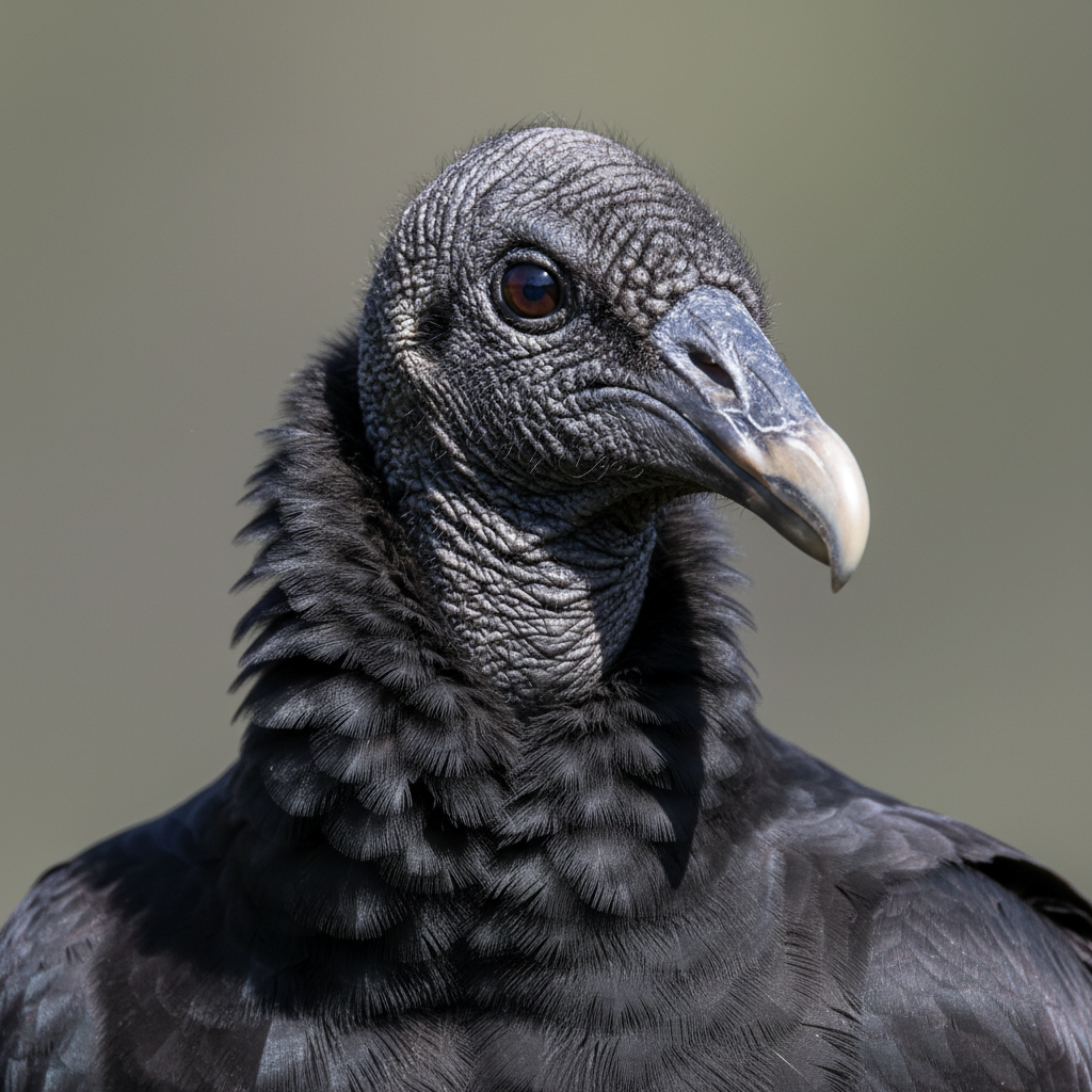 Black vultures are large, stocky birds with black plumage, a featherless black head, and short, rounded wings. They have a distinctive, almost tailless silhouette in flight, flapping their wings more frequently than turkey vultures. Adults have gray legs and feet.