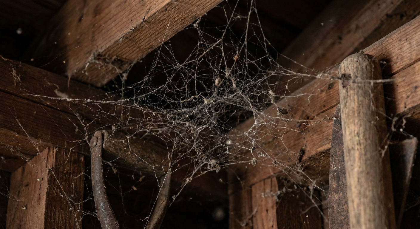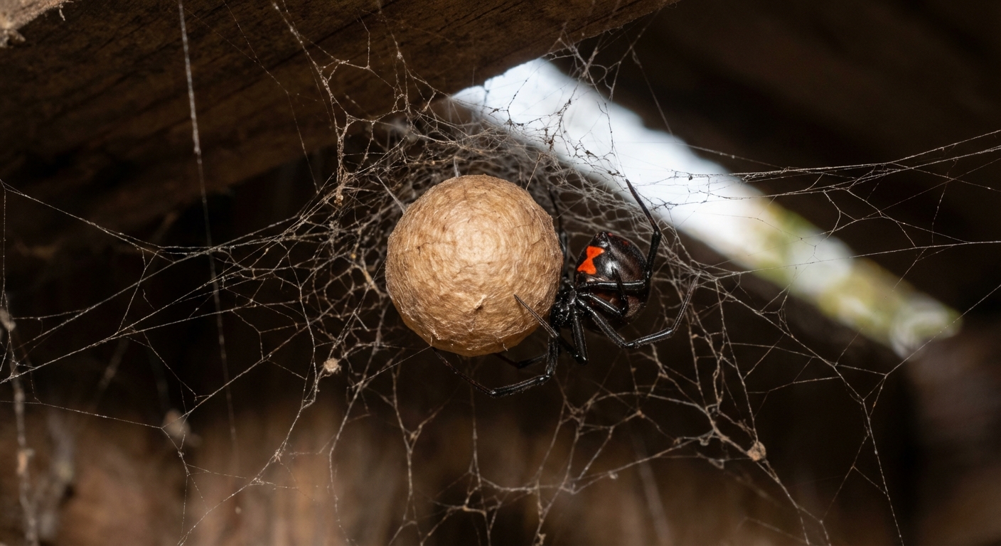 Black widows are shy and build their messy, irregular webs in undisturbed, low-to-ground locations — under decks, in meter boxes, around downspout bases, inside stored shoes, under outdoor furniture, and in garages. Their webs feel noticeably strong and sticky compared to other cobwebs. Finding the distinctive tangle web in a dark, protected location with a spherical egg sac (tan, papery, about 1/2 inch) confirms their presence.