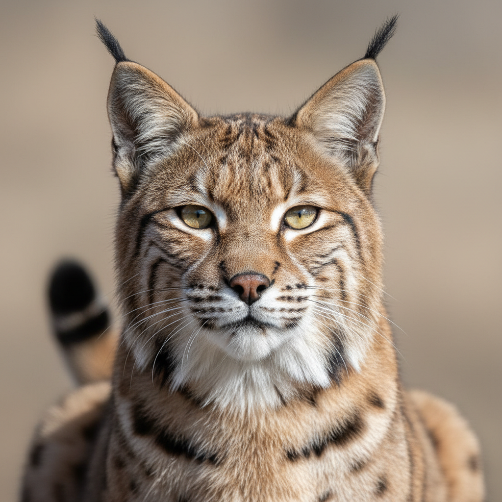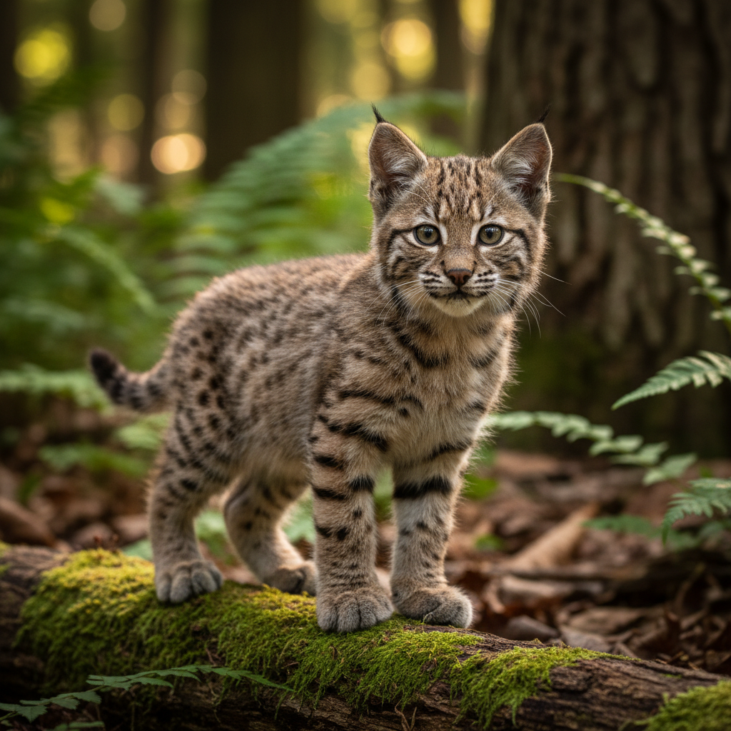 Bobcats are medium-sized wild cats with a distinctive bobbed tail (3-7 inches), tufted ears, and spotted or streaked fur. They have a ruff of fur around their face and come in a range of colors from light gray to reddish-brown. Adults typically weigh between 15 and 40 pounds.