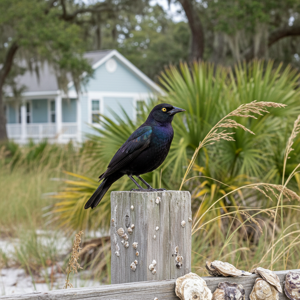 Brewer's Blackbirds are adaptable and found in various habitats, including urban and suburban areas in coastal SC. They often forage in open fields, parks, and lawns, and may nest in trees or shrubs near residential areas. The humid subtropical climate provides ample food sources for them.