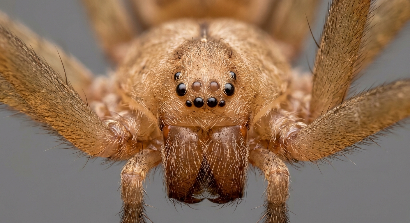 Brown recluse spiders are light to dark brown, about the size of a quarter including legs. Their most distinctive feature is a dark, violin-shaped marking on the cephalothorax (head region) with the neck of the violin pointing toward the abdomen. Unlike most spiders, brown recluses have six eyes arranged in three pairs rather than the typical eight. Their legs are long, thin, and uniformly colored without bands or spines.