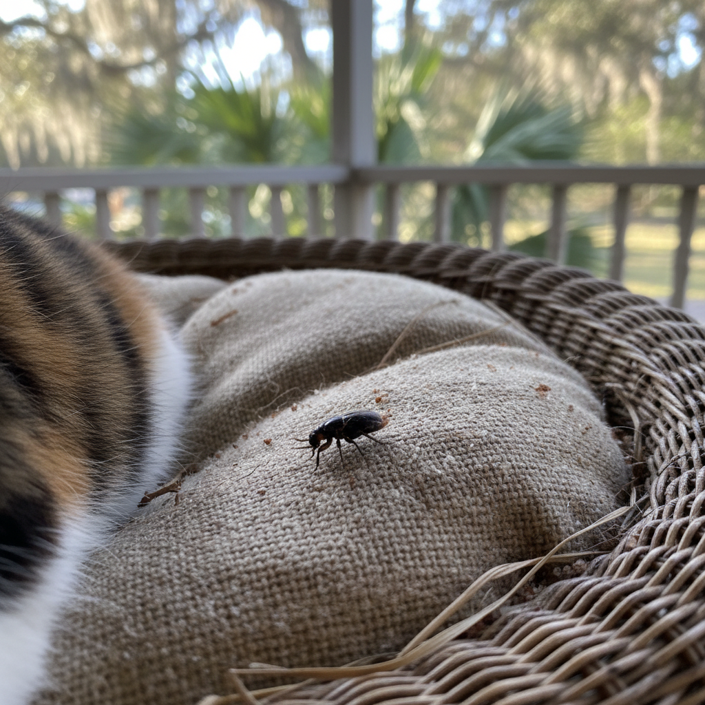 Cat fleas thrive in the warm, humid subtropical climate of coastal South Carolina. They are commonly found on pets, in pet bedding, carpets, and upholstery. Outdoor habitats include shaded areas in yards, under porches, and in crawl spaces, especially near homes in Myrtle Beach with sandy soils.