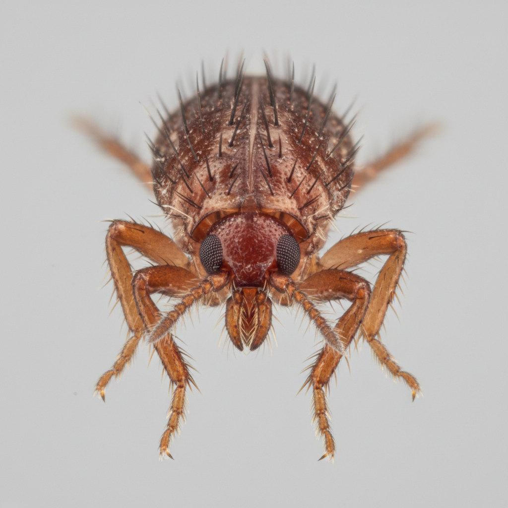 Cat fleas are small, wingless insects, typically 1-2 mm long, with a dark reddish-brown, flattened body. They have powerful hind legs adapted for jumping and piercing-sucking mouthparts. They lack wings.