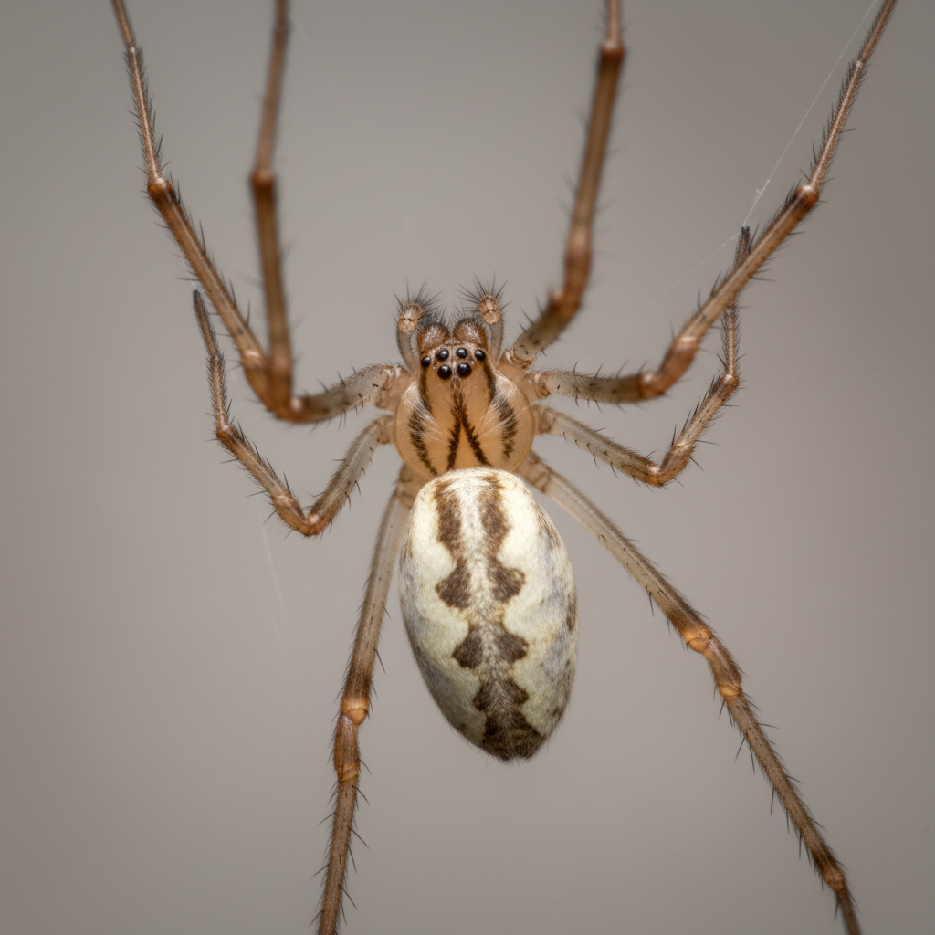 Cellar spiders are easily recognized by their extremely long, thin legs and small, cylindrical body. They are pale yellow to light brown in color and have eight eyes arranged in two groups of three with two smaller eyes in between. Their delicate appearance belies their hunting prowess.