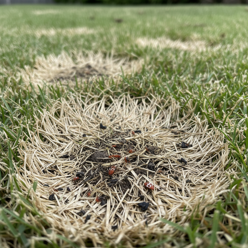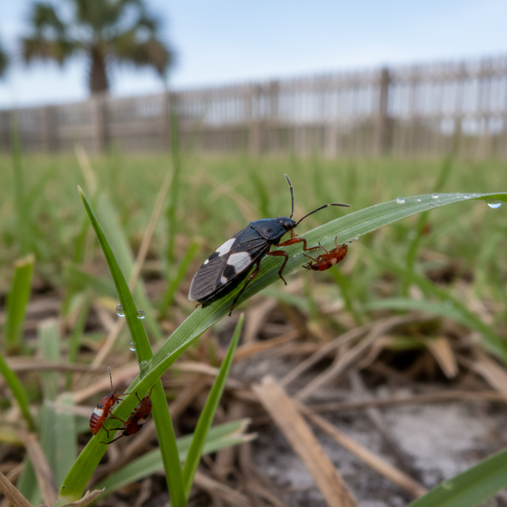 Chinch bugs suck sap from grass blades, injecting toxins that cause the grass to turn yellow, then brown, and eventually die. This creates irregular dead patches in the lawn, often mistaken for drought stress in our hot Myrtle Beach summers.