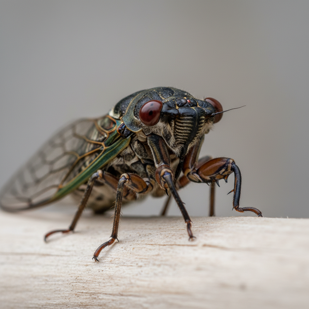 Cicadas are large, stout-bodied insects with prominent eyes and membranous wings. They are typically black or brown with green or orange markings, ranging from 1 to 2 inches in length. The most distinctive feature is the loud buzzing or clicking sound produced by males to attract mates.