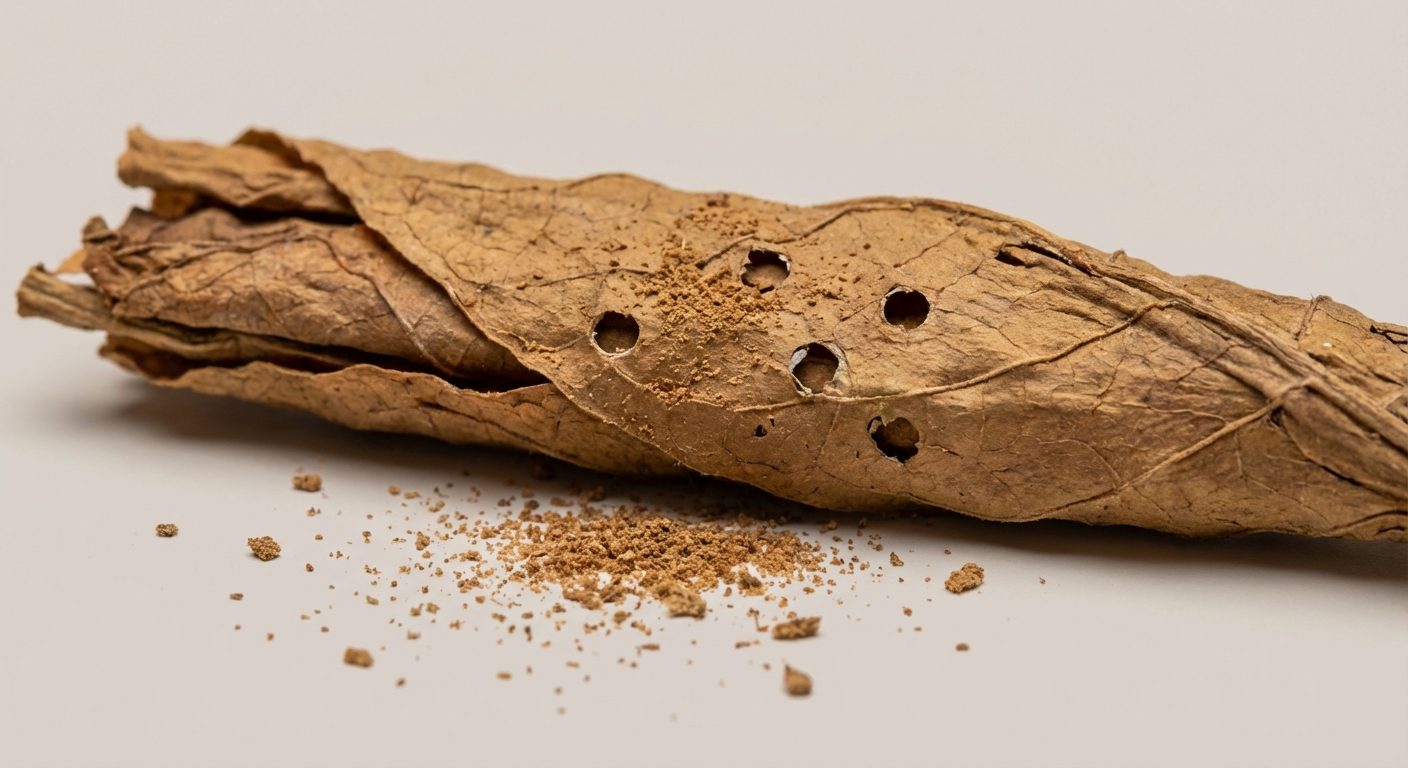 Look for small, round holes in stored products like dried tobacco, spices, pet food, or cereals. You may also find the beetles themselves crawling around or dead beetles near infested items. A fine, powdery dust (frass) near the infested products is also a sign.