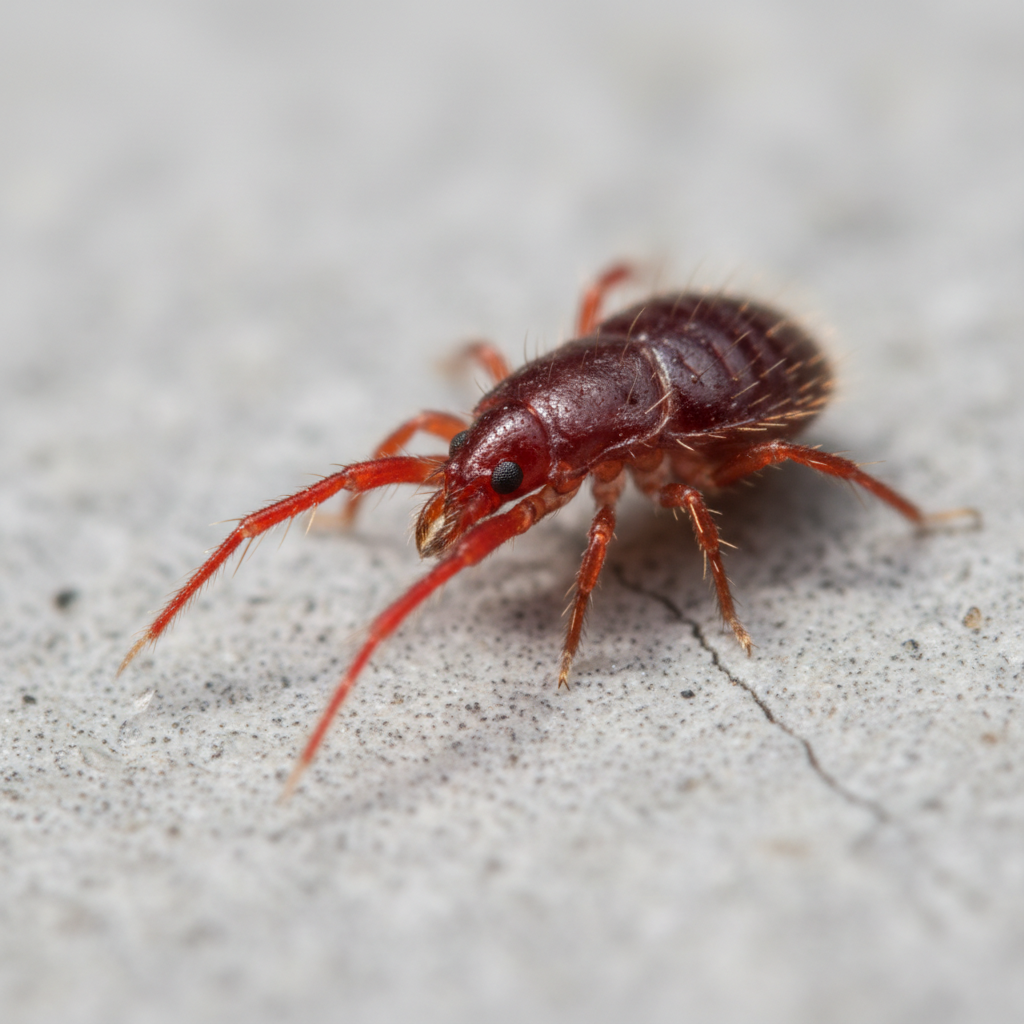 Clover mites are tiny, reddish-brown arachnids, slightly larger than a pinhead. A key identifier is their noticeably long front legs, which are longer than the other six legs. They are often found in large numbers on sunny surfaces.