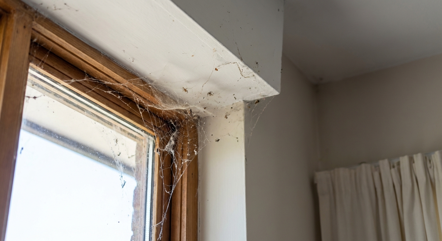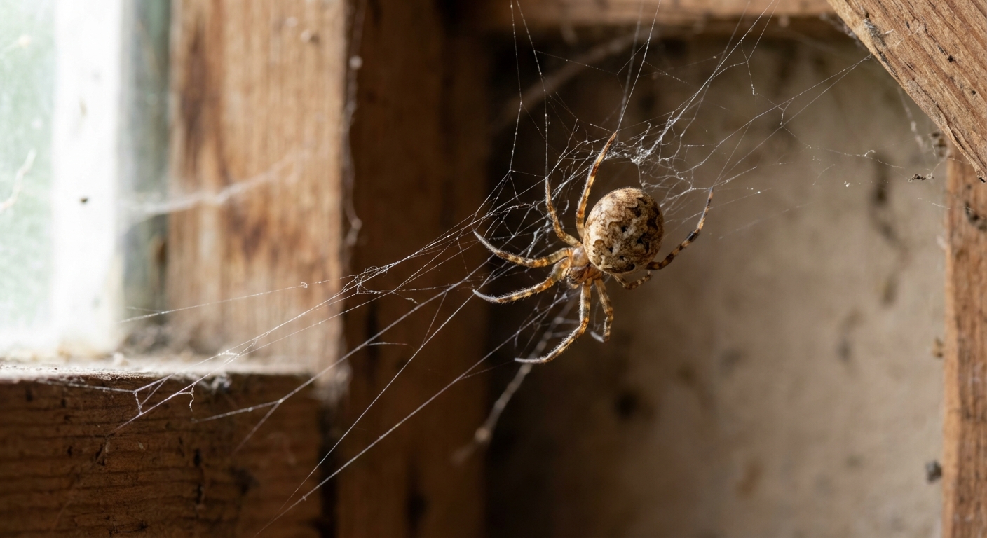 The most obvious sign is the accumulation of tangled cobwebs in upper corners of rooms, around window frames, in basements, garages, and crawlspaces. Abandoned webs collect dust and become the classic 'cobweb' associated with neglected spaces. You may also find small, round, brownish egg sacs wrapped in silk within or near the web. Seeing multiple spiders or dense webbing indicates a healthy prey insect population in the home.
