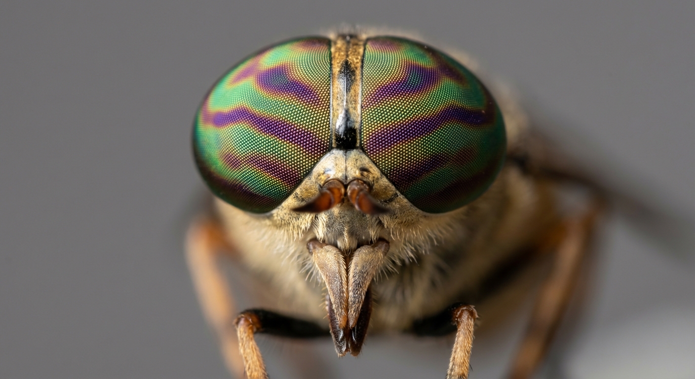 Deer flies are medium-sized flies, typically with yellowish-brown to dark brown bodies. They are characterized by their brightly colored, patterned eyes, which can be green, gold, or purple. Their wings usually have dark bands or spots.