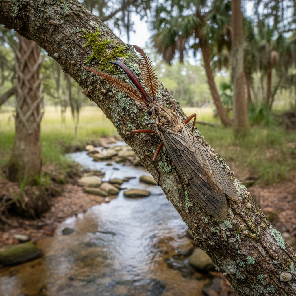 Dobsonflies are found near rivers, streams, and other bodies of water in the coastal regions of South Carolina. The larvae, hellgrammites, are aquatic and require clean, flowing water to thrive. Adults are often found near lights at night, especially during their mating season in the humid subtropical climate of Myrtle Beach.