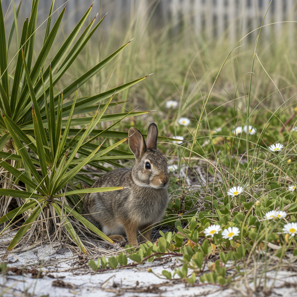 Eastern cottontails are common throughout the Grand Strand, thriving in the diverse habitats of coastal South Carolina. They prefer areas with dense vegetation for cover, such as brush piles, thickets, and overgrown gardens. They can be found in both residential and rural areas, including near salt marshes and tidal creeks around Myrtle Beach.