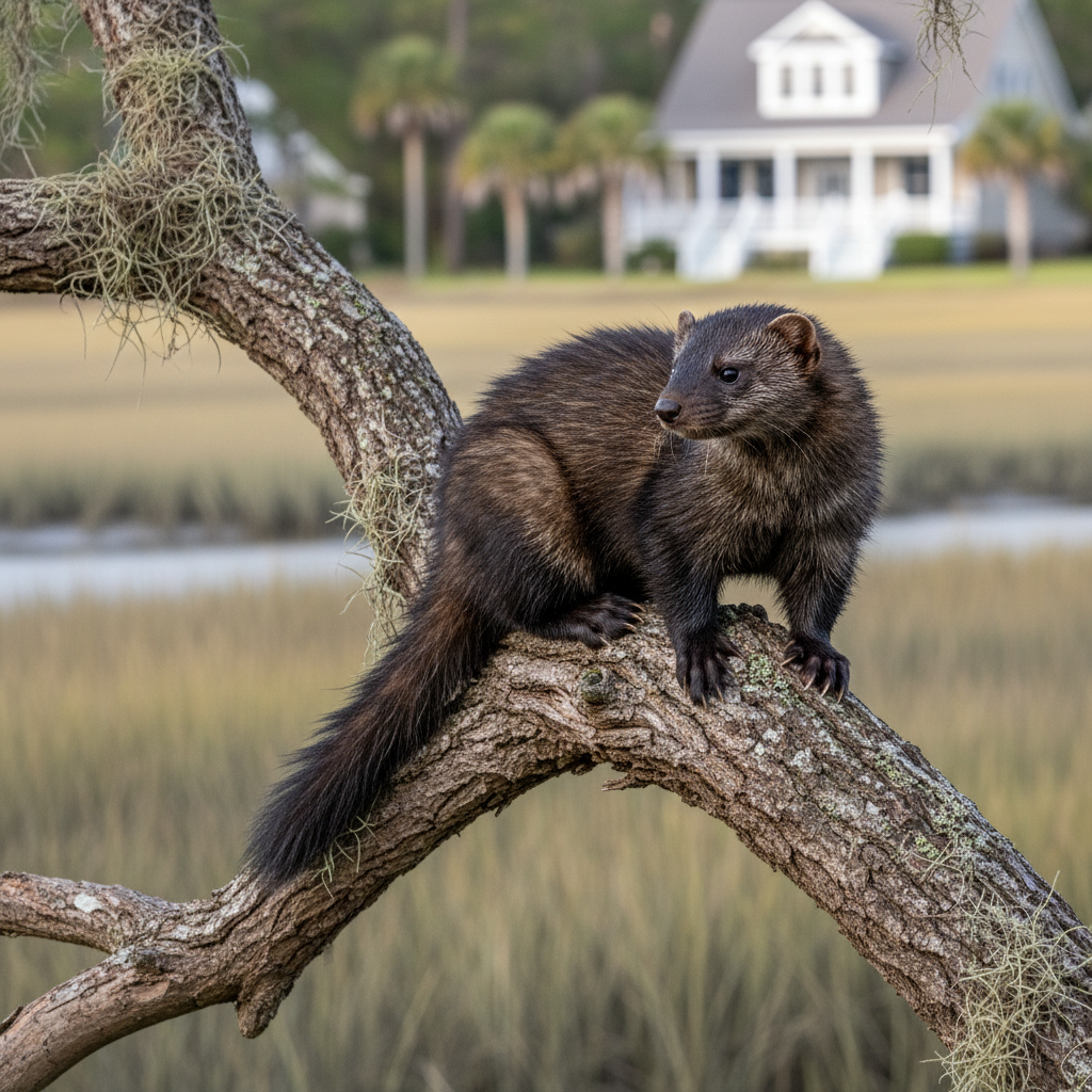 Do not approach the animal. Keep pets indoors and contact the SC Department of Natural Resources or a licensed wildlife removal specialist. They can provide advice on how to safely remove the fisher and prevent future encounters in your Myrtle Beach neighborhood.