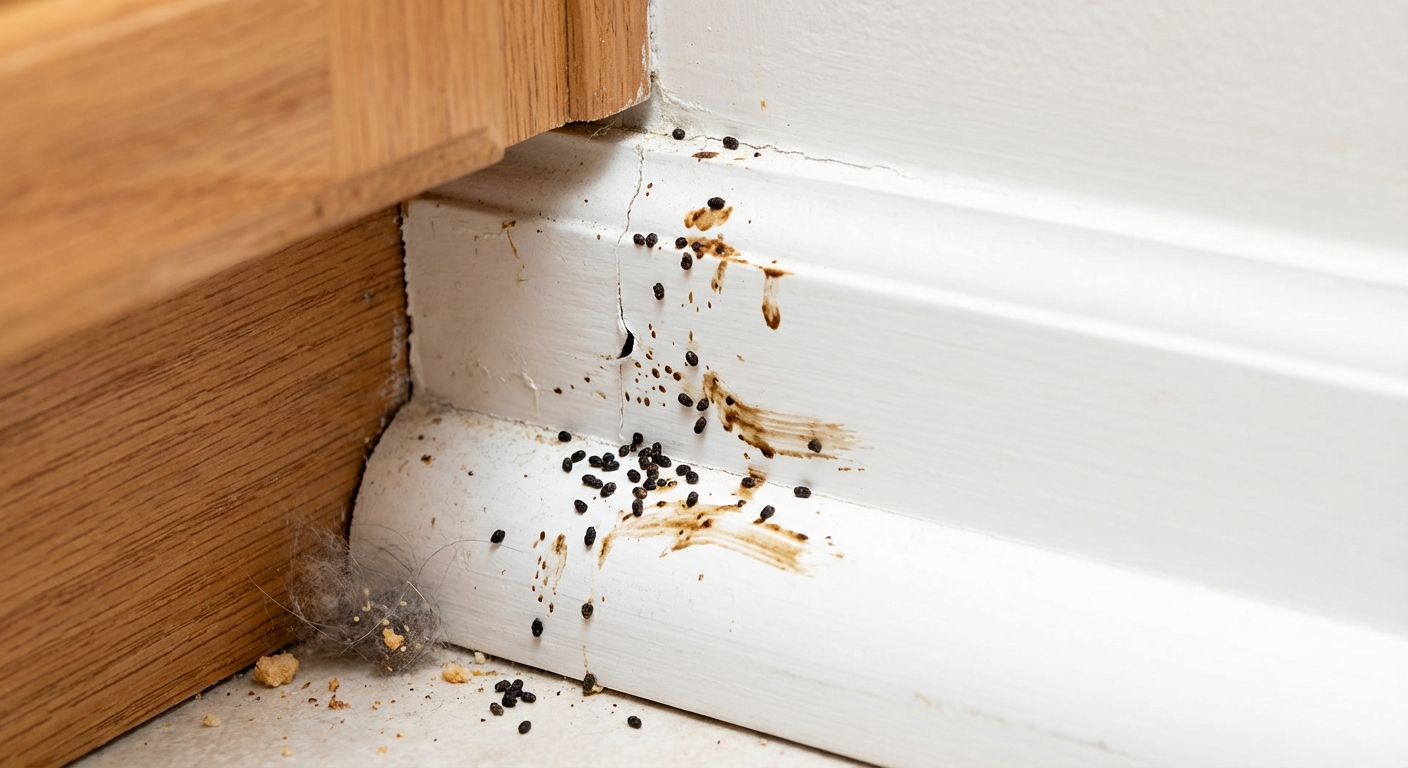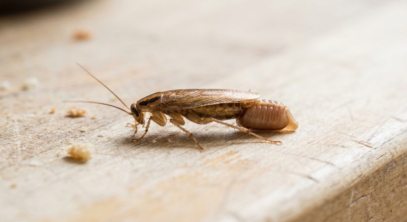German cockroaches are nocturnal; seeing them during the day usually indicates a heavy infestation. Look for dark, pepper-like droppings in kitchen drawers, along countertop edges, and behind appliances. You may notice a musty odor in heavy infestations. Egg cases (oothecae) are light brown, purse-shaped, and about 1/4 inch long, often found in crevices near food and water sources.