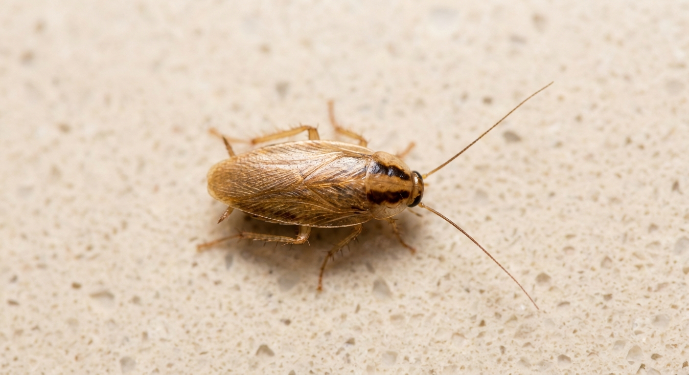 German cockroaches are light brown to tan, about 1/2 to 5/8 inch long, with two distinctive dark parallel stripes running from head to the base of the wings. Despite having wings, they rarely fly. Nymphs are smaller and darker, almost black, with the same parallel stripe pattern. They are the most common indoor cockroach species in North America.