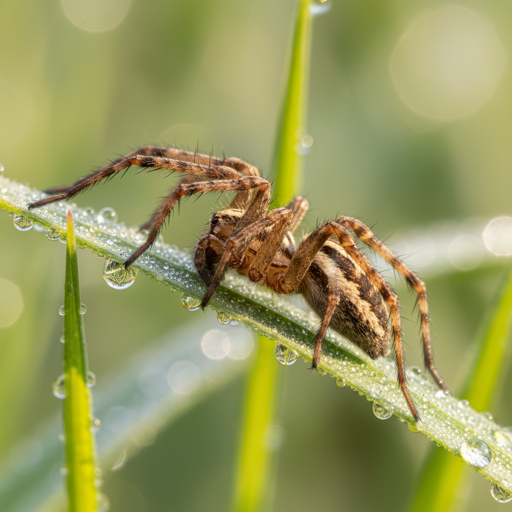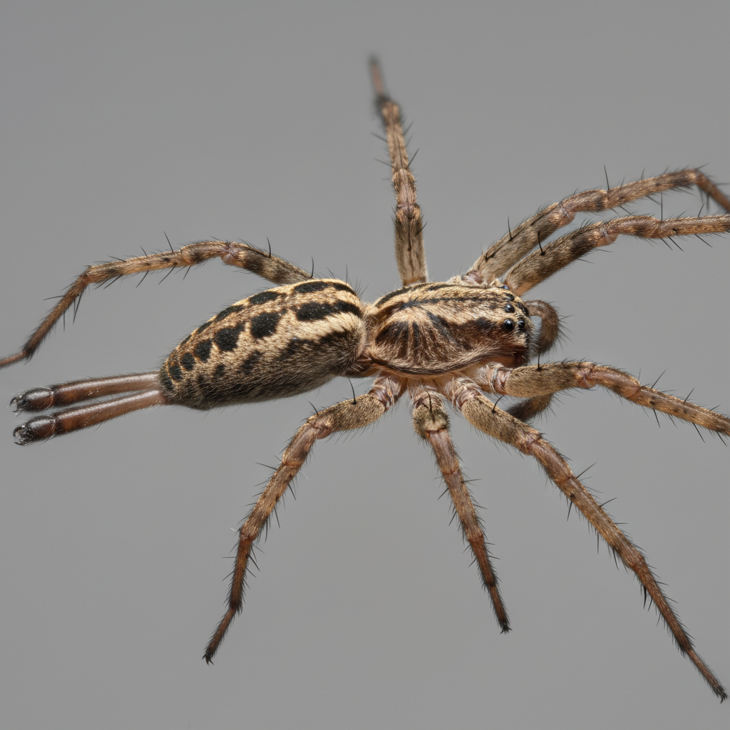 Grass spiders are typically brown or tan with darker stripes or patterns. They have elongated bodies and are known for their speed. A key identifying feature is their prominent spinnerets at the rear of their abdomen, which they use to build sheet-like webs with a funnel-shaped retreat.