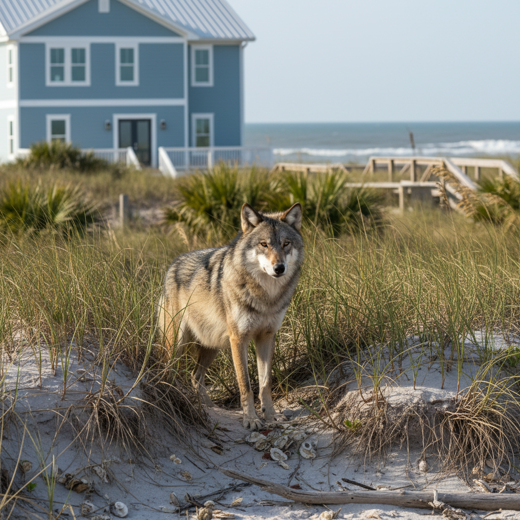 Gray wolves are large canids, typically weighing between 80 and 110 pounds, with a thick fur coat ranging in color from gray to black to nearly white. They have powerful jaws, a bushy tail, and erect, rounded ears. Their presence in suburban areas is rare but possible, especially near undeveloped regions of the Grand Strand.