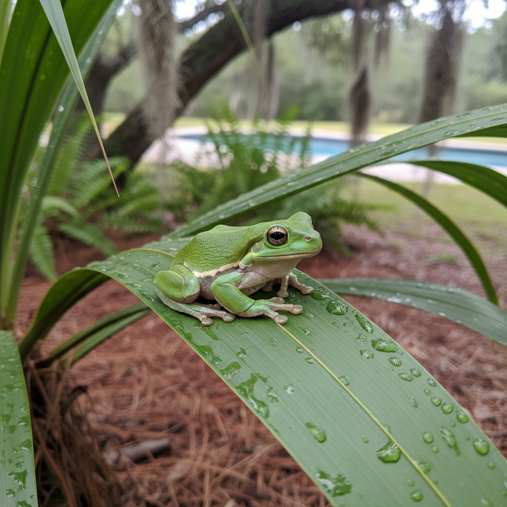 Green tree frogs thrive in the humid subtropical climate of coastal South Carolina. They are commonly found near ponds, marshes, streams, and other bodies of fresh water. In residential areas, they often inhabit gardens, shrubs, and around structures with access to moisture, all common features of the Myrtle Beach landscape.