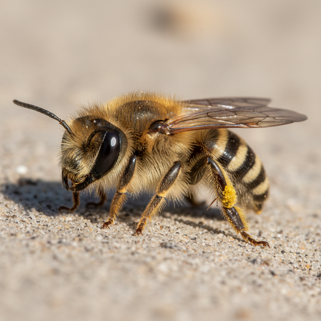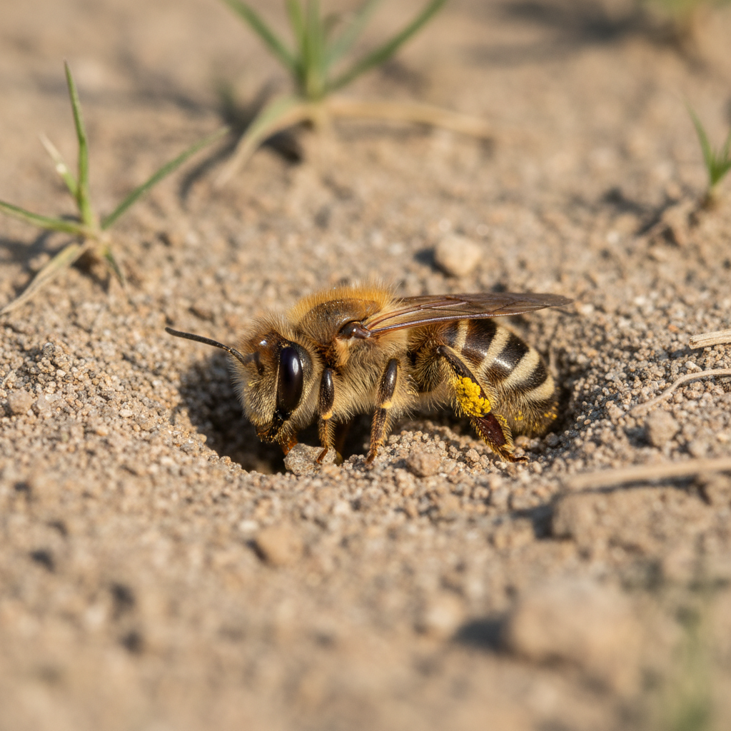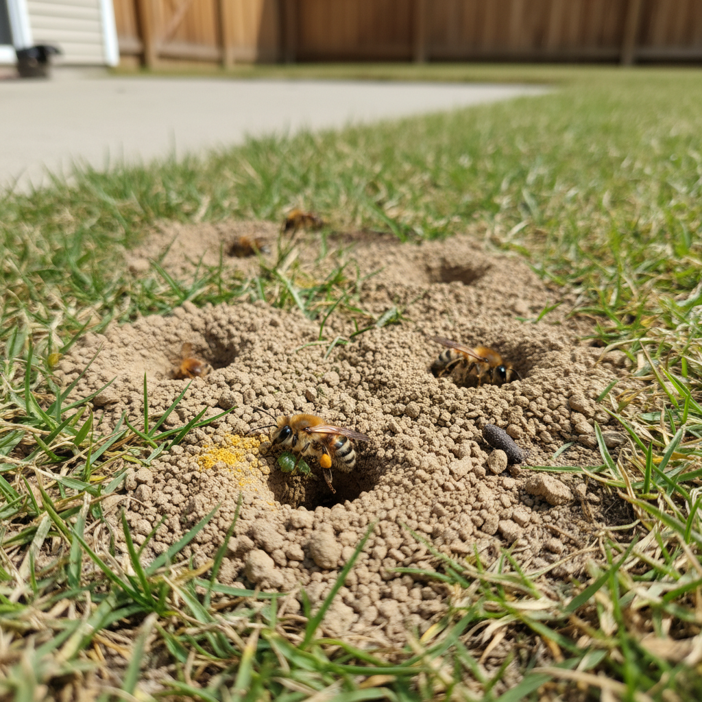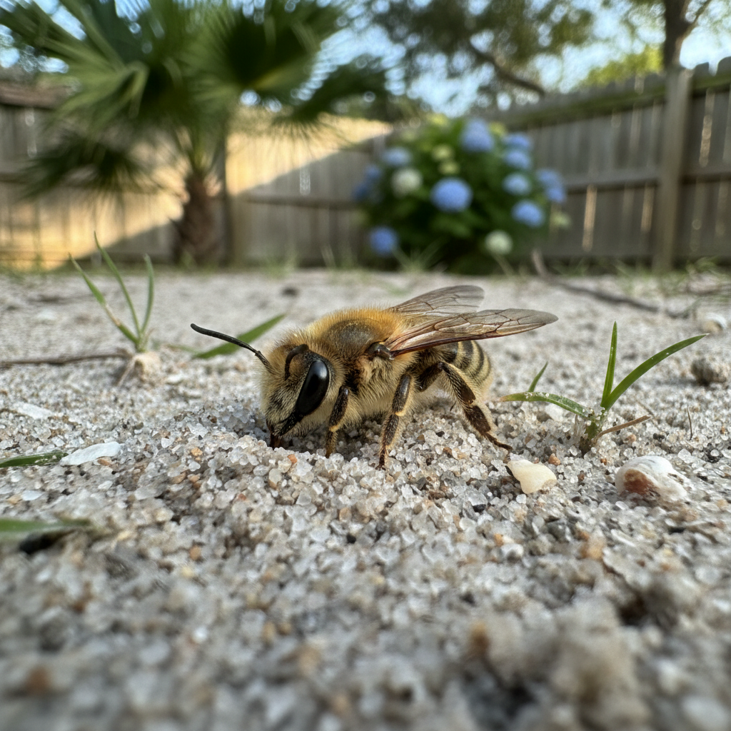 Ground bees prefer dry, sandy soils for nesting, making the coastal geography of Myrtle Beach ideal habitat. They commonly nest in lawns, gardens, and along the edges of driveways and patios. The humid subtropical climate of coastal South Carolina allows for extended nesting seasons.