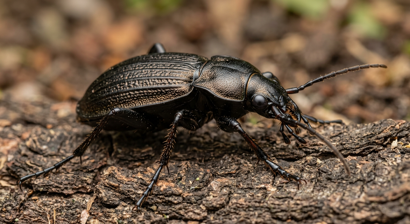 Ground beetles are typically black, shiny, and range from 1/4 to 1 inch in length. They have elongated bodies, ridged wing covers, and thread-like antennae. Their legs are adapted for running, making them fast-moving predators.
