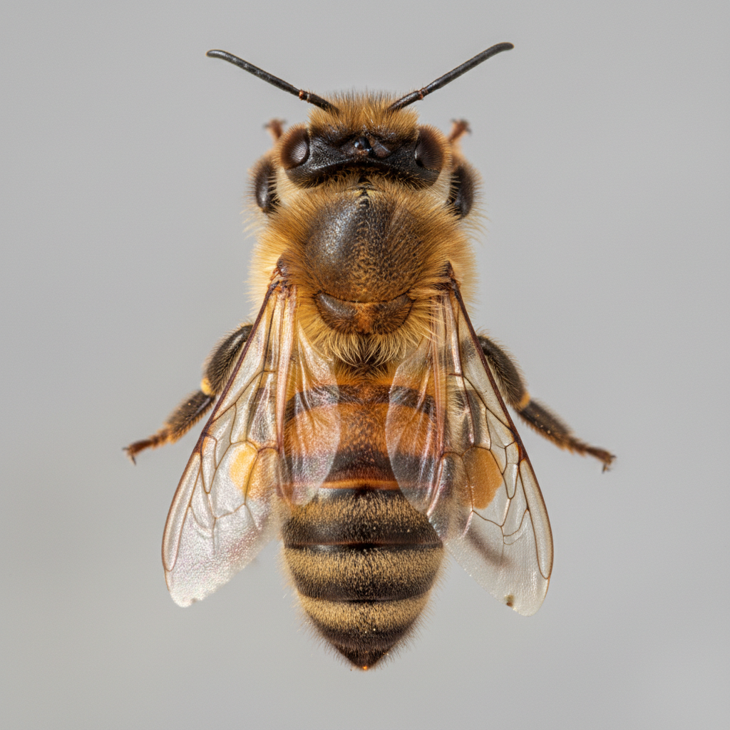 Honey bees are typically golden brown with black stripes and are about ½ to 5/8 inches long. They have fuzzy bodies and carry pollen in pollen baskets on their hind legs. Unlike wasps, honey bees are relatively docile and only sting when threatened.