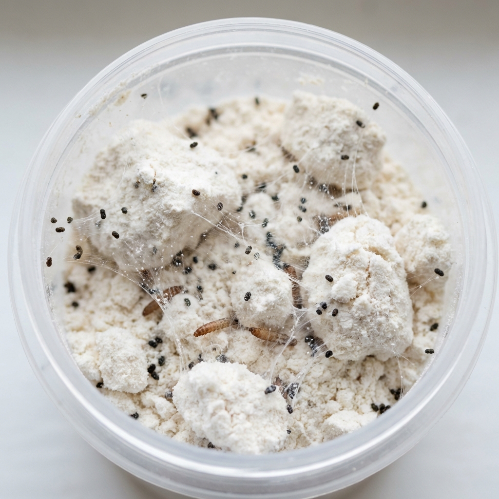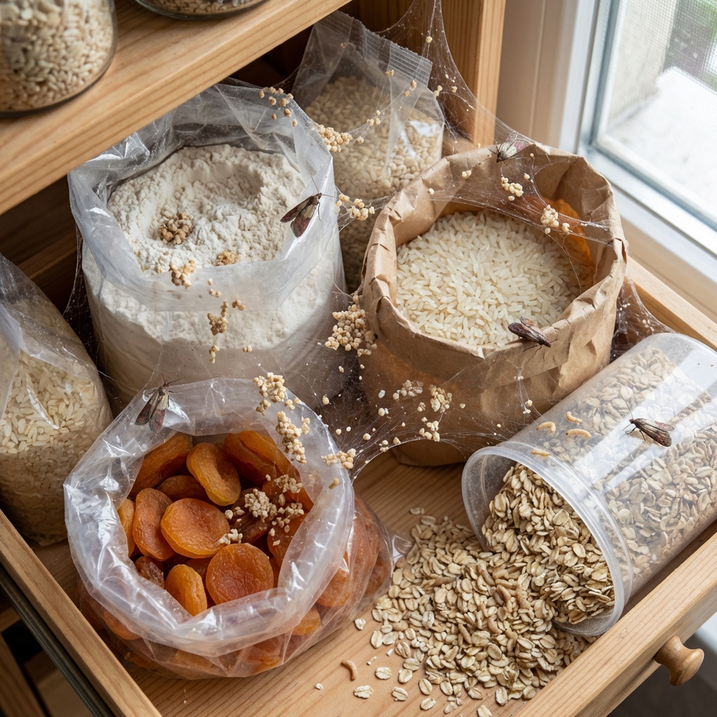 Look for webbing in stored food products like grains, cereals, nuts, and dried fruit. You may also see larvae crawling on shelves or walls, or adult moths flying around your kitchen, particularly at dusk. Clumps of infested food stuck together with silken threads are a telltale sign.