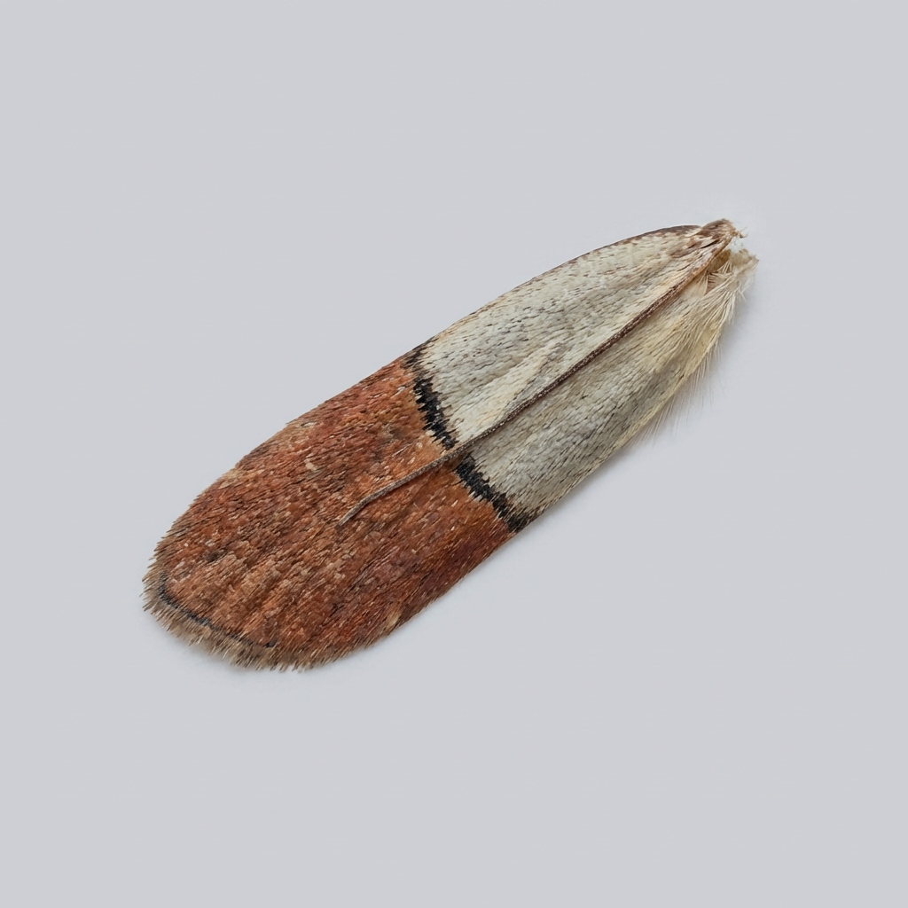 Indian meal moths are small, about 1/2 inch long, with a distinctive bi-colored appearance. The forewings are bronze or copper-colored on the outer two-thirds and whitish-gray on the inner third. The larvae are cream-colored with brown heads.
