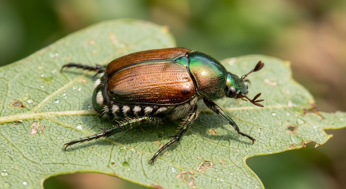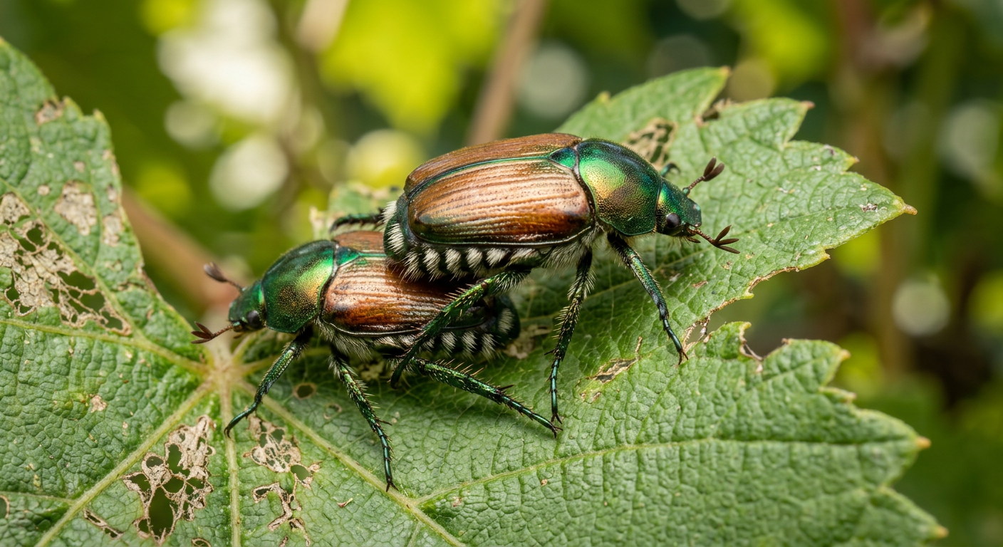 Japanese beetles are metallic green beetles about 1/2 inch long with bronze-colored wing covers. They have five patches of white hairs along each side of their abdomen, making them easily identifiable. These beetles often congregate in large numbers, causing significant damage to plants.