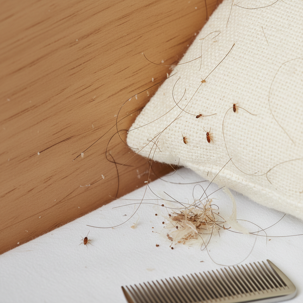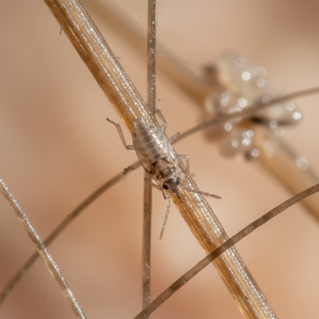 Adult lice are small, wingless insects, about the size of a sesame seed. They are grayish-white to tan and have six legs, each with a claw for gripping hair. Nits (lice eggs) are small, oval-shaped, and firmly attached to hair shafts.