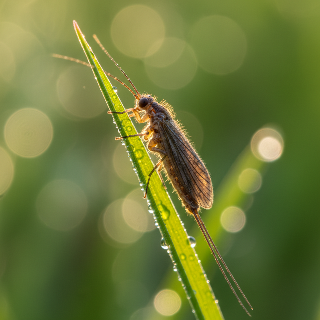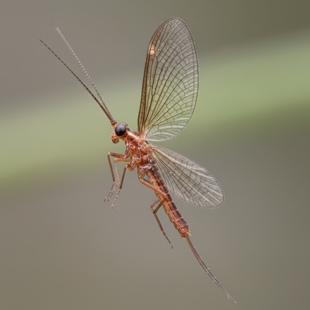 Mayflies are delicate insects with slender bodies, two or three long tail filaments, and prominent, veined wings held upright at rest. They range in color from pale yellow to brown and are typically 0.5 to 1 inch long. A key identifier is the presence of long cerci (tails) that can be longer than their body.