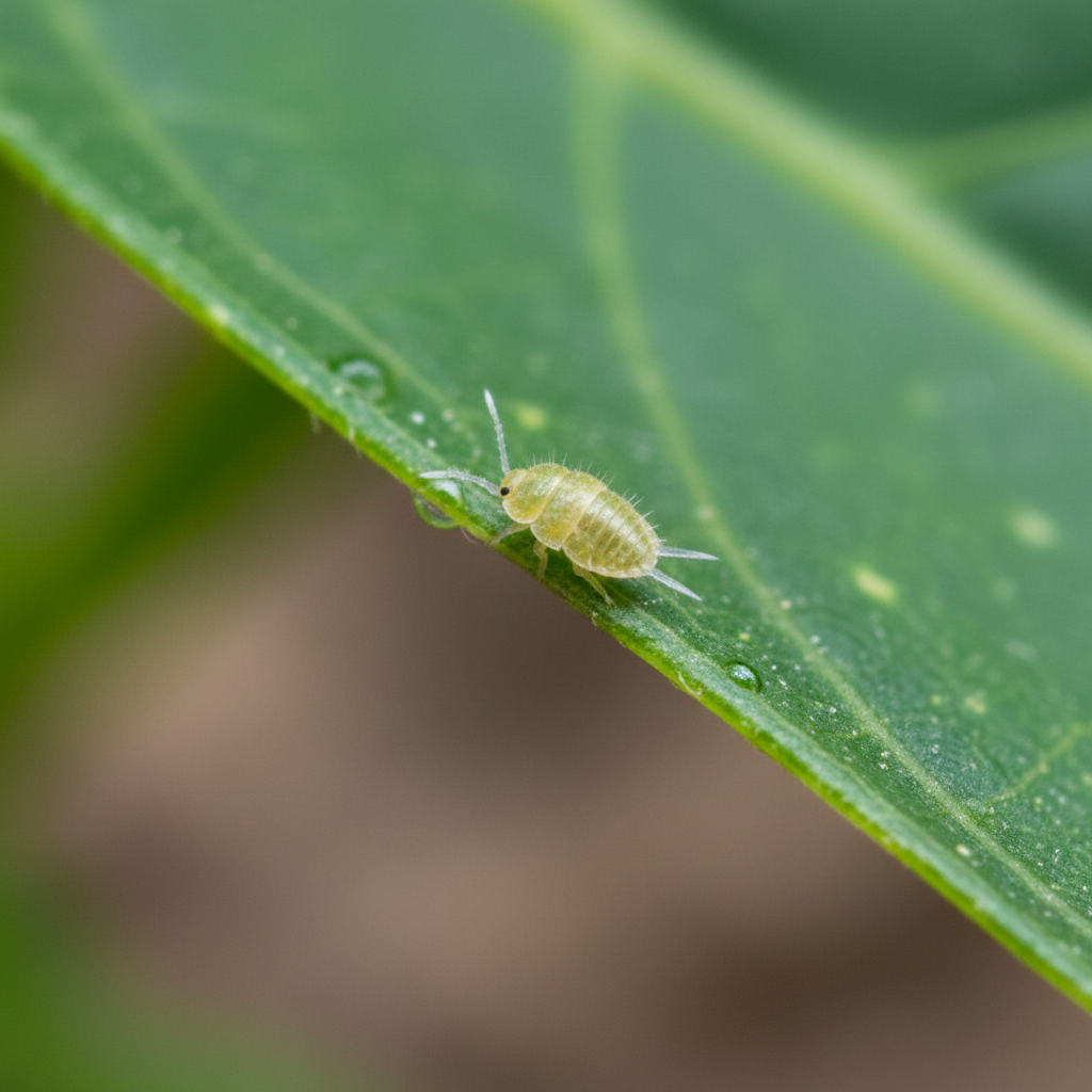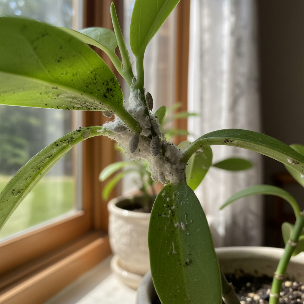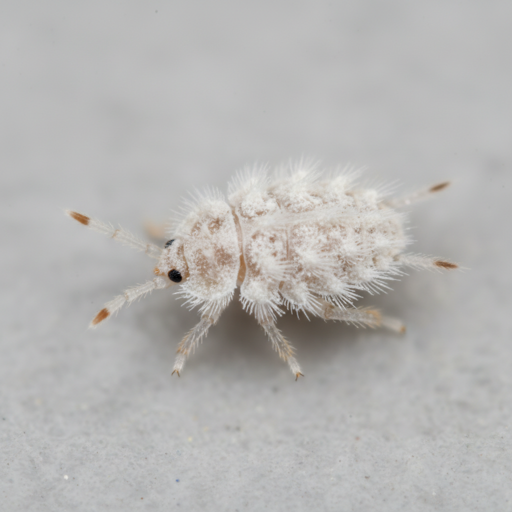 Mealybugs are small, soft-bodied insects covered in a white, cottony wax. They are typically oval-shaped and slow-moving, often found in clusters on plant stems and undersides of leaves. Adult females are wingless and produce an egg sac covered in the same waxy material.