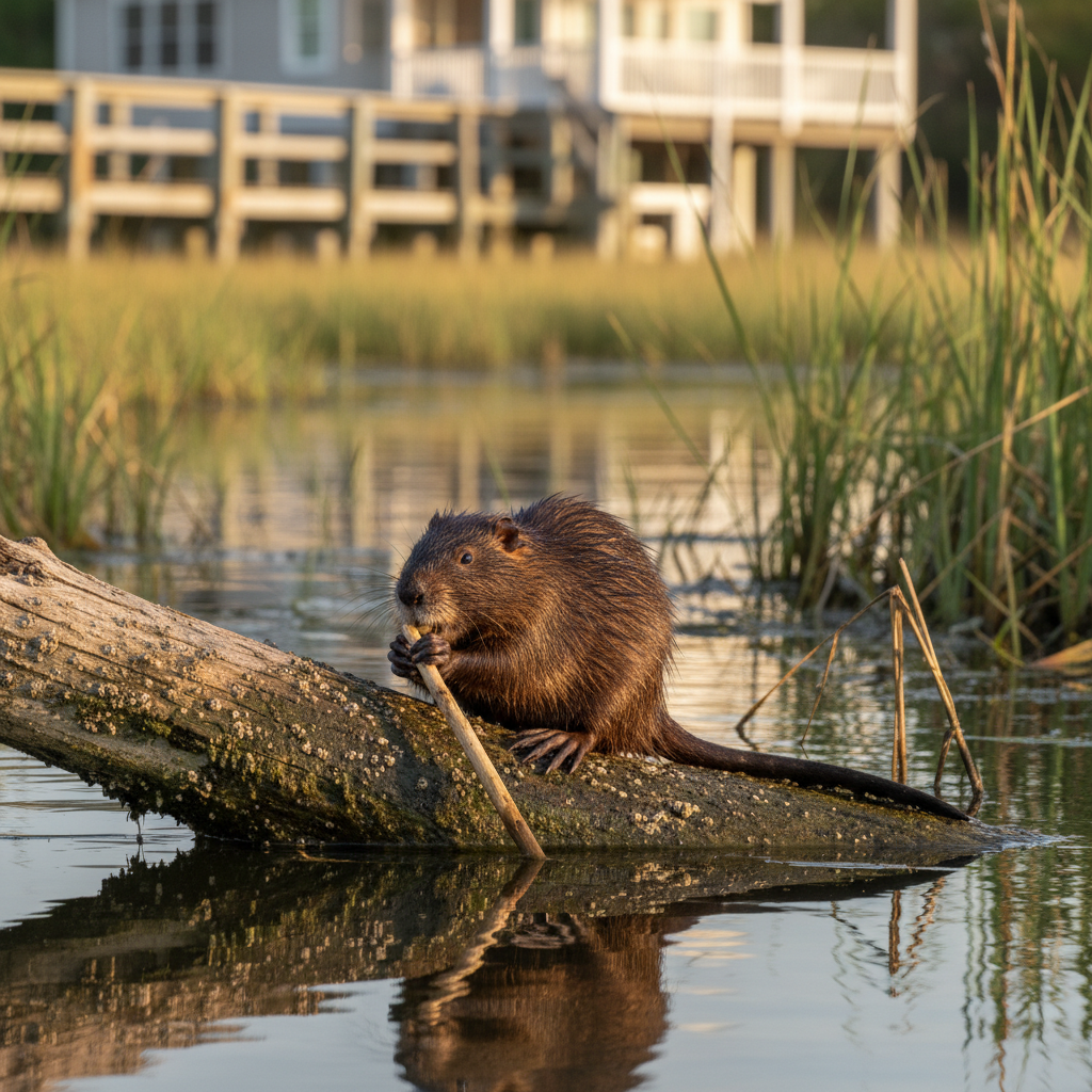 Muskrats burrow into banks, weakening them and potentially causing erosion and structural damage to docks and seawalls in Myrtle Beach. Their feeding can also impact aquatic vegetation.