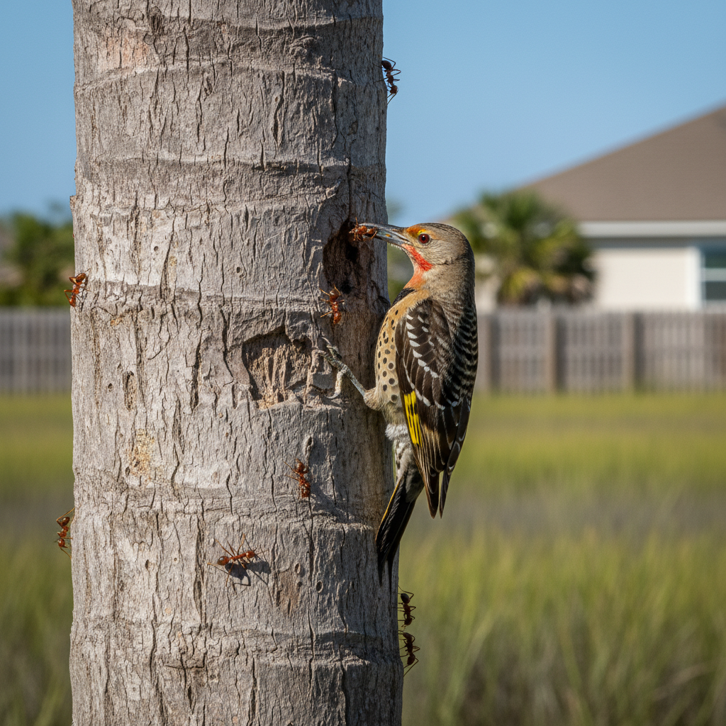 Northern flickers are common in wooded areas, parks, and suburban environments throughout coastal South Carolina. They are often seen foraging for insects on the ground, a habit that makes them more visible than other woodpeckers. They adapt well to the humid subtropical climate of the Grand Strand.