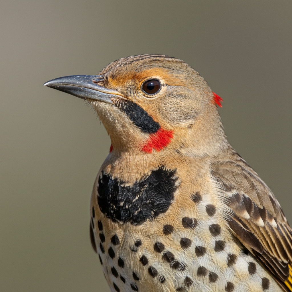 Northern flickers are medium-sized woodpeckers with a brown back, spotted underparts, and a black bib. They have a distinctive white rump patch visible in flight. Male flickers in the eastern US have a black 'mustache' mark on their cheeks.