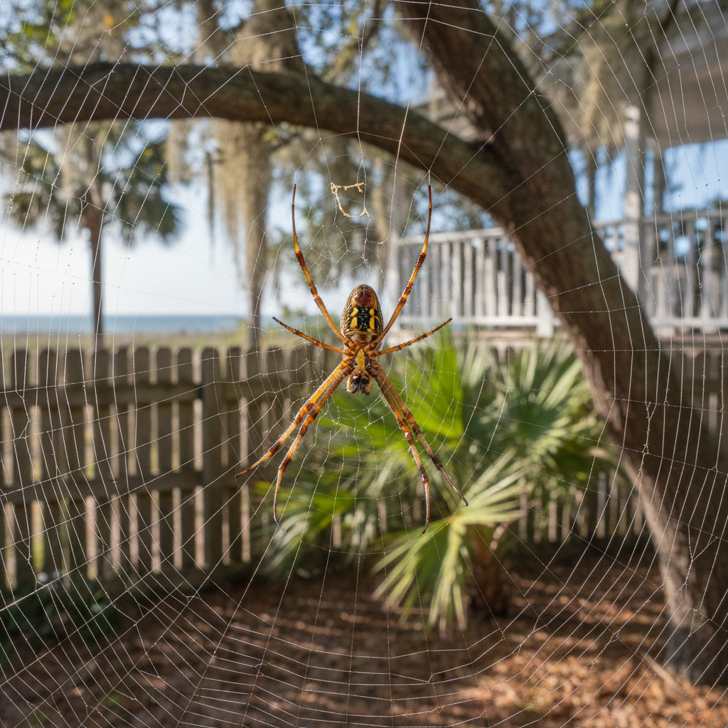 Orb weaver spiders are commonly found in gardens, woodlands, and around homes throughout the Grand Strand. They thrive in the humid subtropical climate of coastal South Carolina, building their webs in areas with abundant insect prey. They are particularly common in areas with dense vegetation and access to open space for web construction.