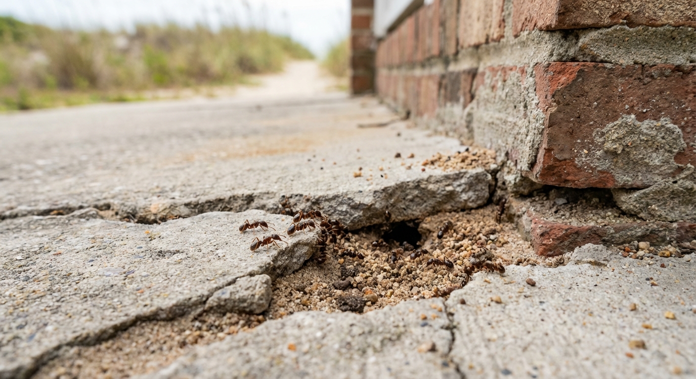 Patios and sidewalks provide ideal nesting sites for pavement ants. The sandy soil and warm temperatures in Myrtle Beach create a perfect environment. Sealing cracks and eliminating food sources can help reduce their presence.