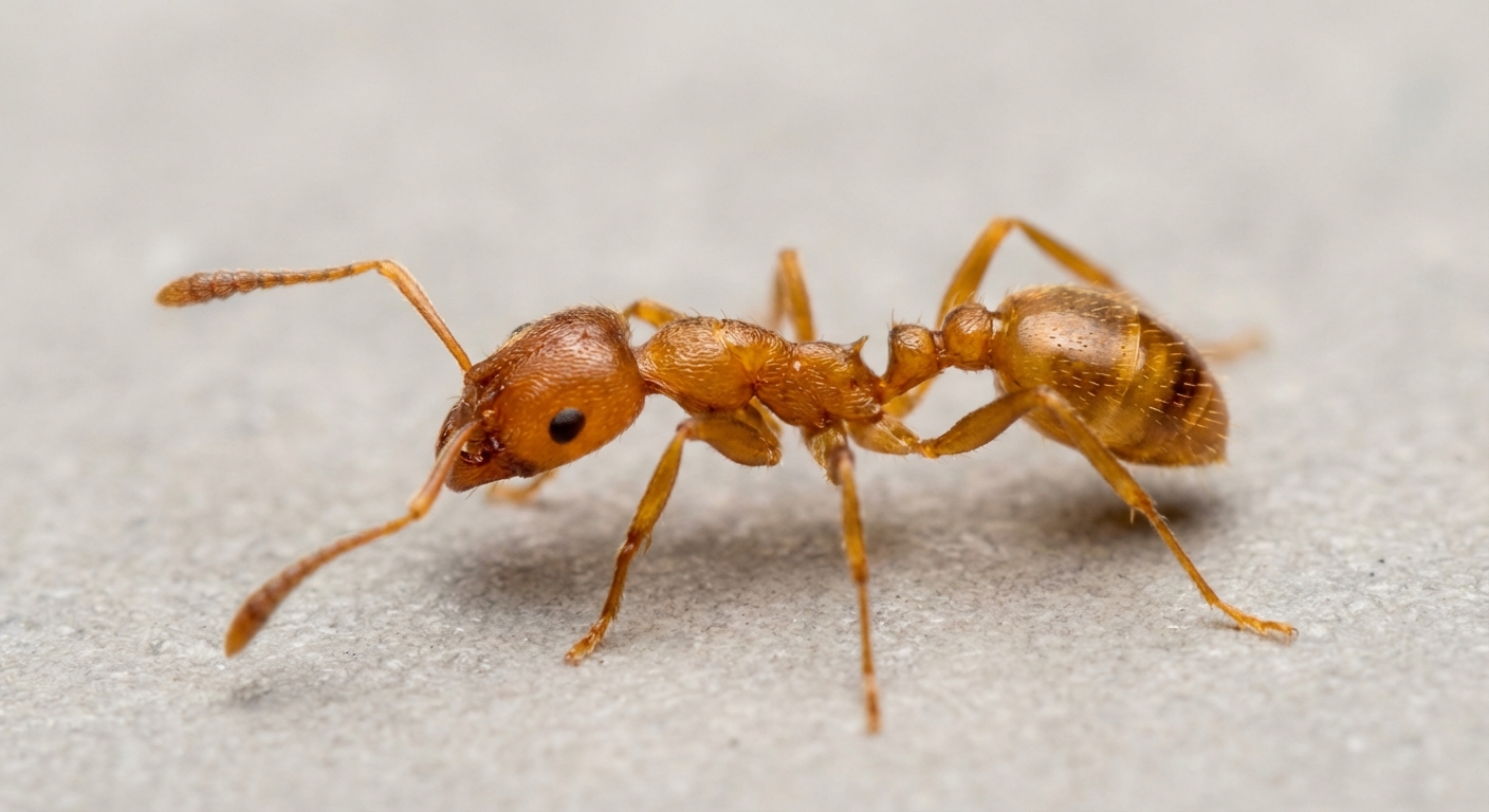 Pharaoh ants are tiny (1/16 inch long), light yellow to reddish-brown ants. They have a two-segmented waist and a stinger, though they rarely sting. These ants are known for their multiple queen colonies, making them difficult to eradicate.