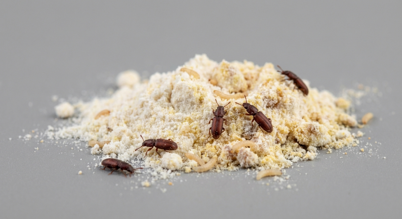 Look for these beetles in stored food products like flour, cereals, pet food, and spices. You may find them crawling around on shelves or inside opened packages. Infested food often has a dusty or gritty texture.